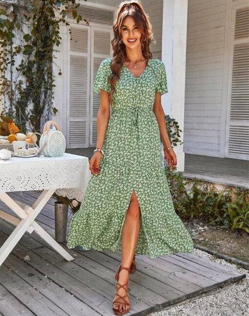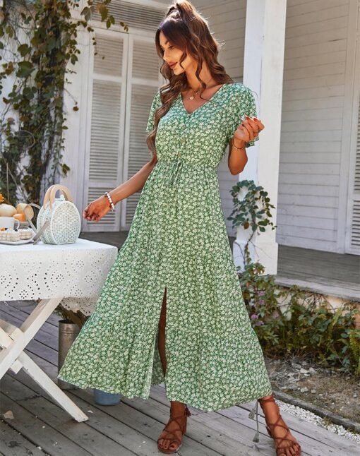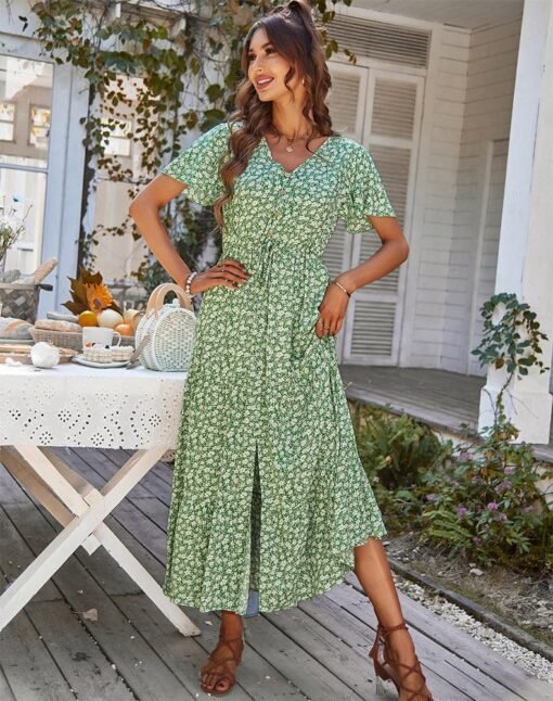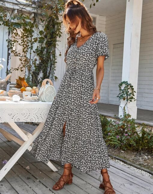 Spring Summer Print Long Dress Women Casual Butterfly Slleve V Neck Button Flroal Dresses For Female Leisure Split Sundress