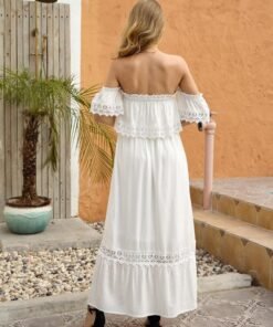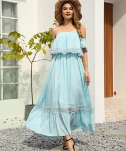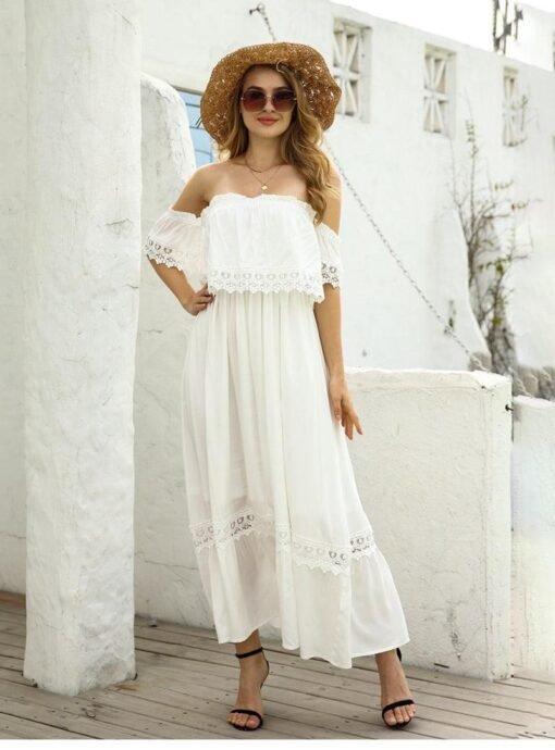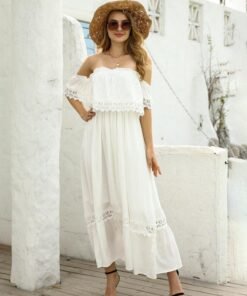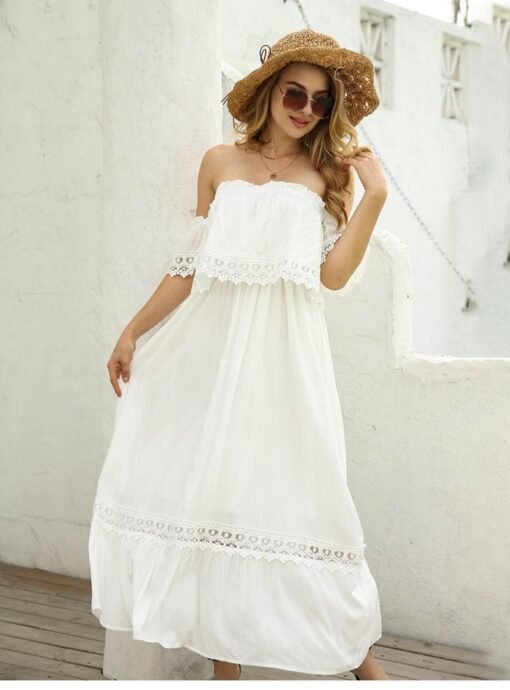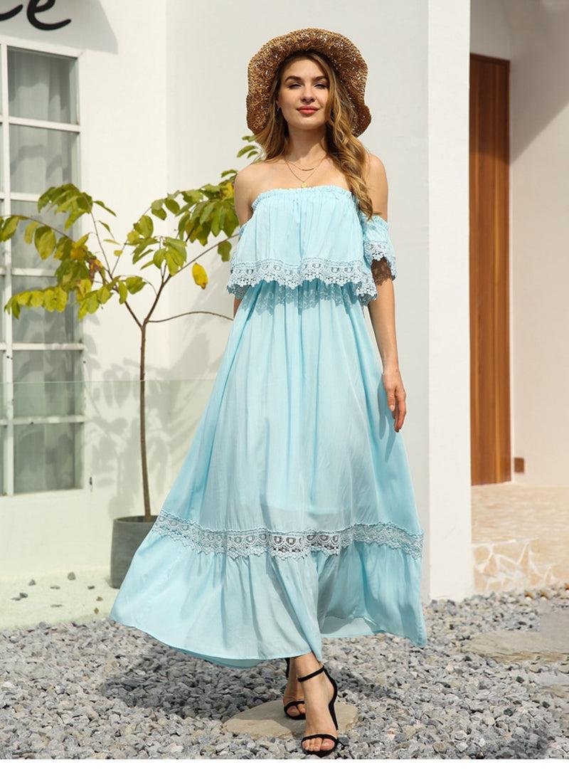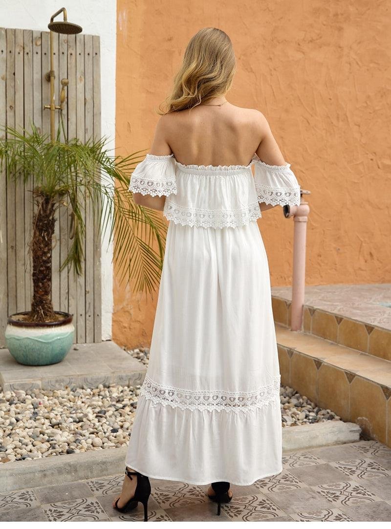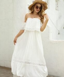 Summer Sexy Backless Strapless Dress Women Lace Short Sleeve Solid Patchwark Ladies Sweet Loose Maxi Dress