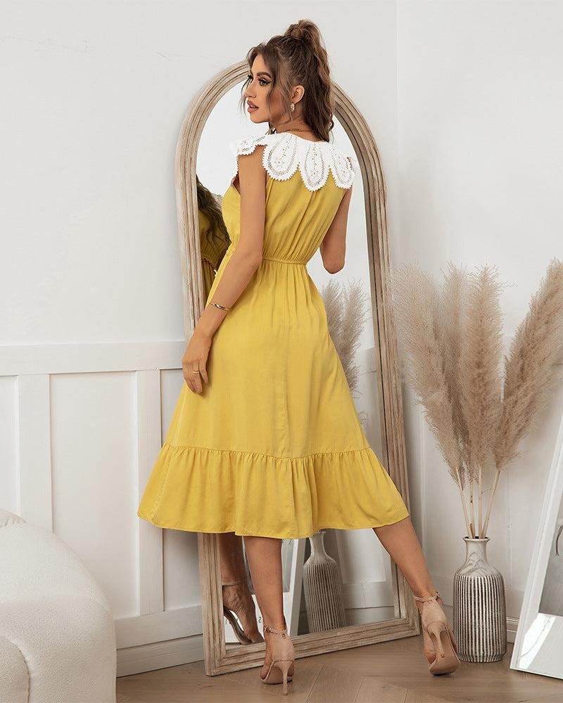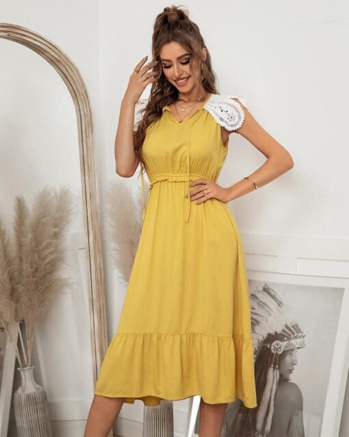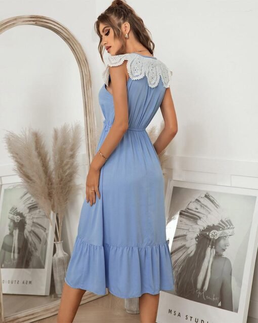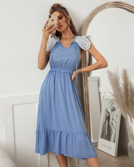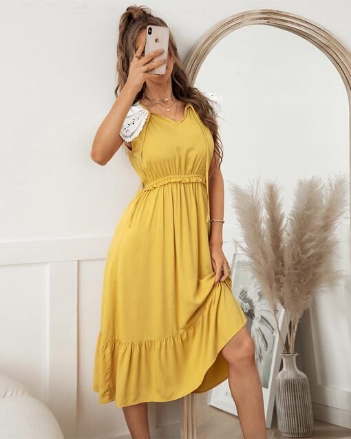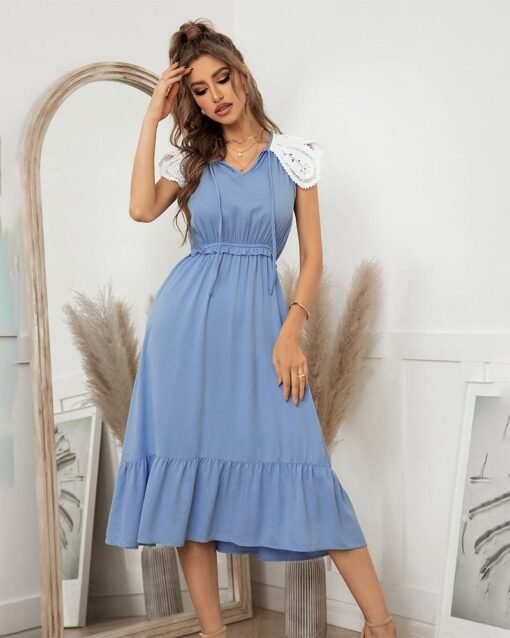 Summer Sweet Lace Patchwork Long Dress Women Casual Lace Up V Neck Ruffles Slim High Waist Ladies Leisure Sundress