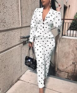 polka dots print 2 piece pants set women buttoned long sleeve tops and pencil pants tracksuit elegant ladies two piece set