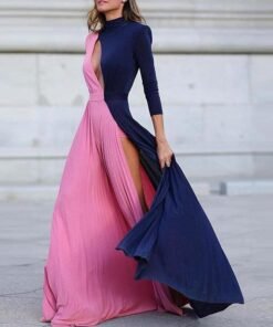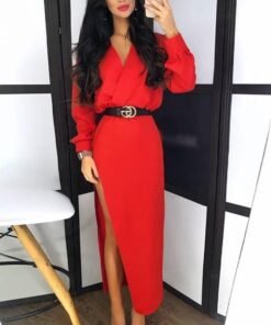 solid long sleeve slit maxi dress women v neck red black white long dress casual loose spring plunge dresses robe femme