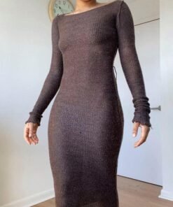 solid knitted open back flared long sleeve maxi dress elegant sexy clothes for women fall resort wear c76-df27