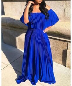 solid ruffles off shoulder pleated dress women solid color blue summer dress elegant high waist maxi dresses robe femme