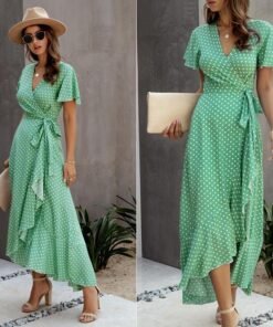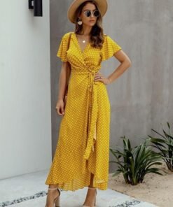 summer maxi dress women polka dot sexy v neck ruffles short sleeve holiday long beach sundress ladies lace up wrap party dresses