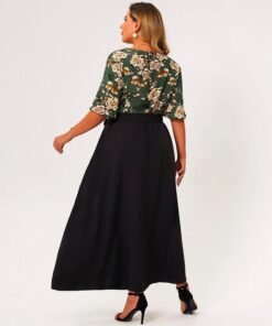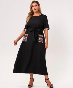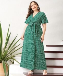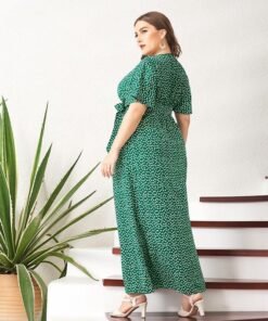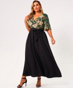 summer maxi dress women plus size green and black loose floral print belt half sleeve v-neck holiday casual large robes