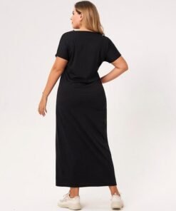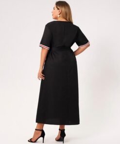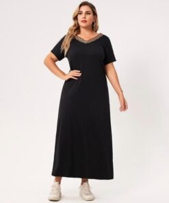 summer long dress plus size women black solid color webbing v-neck short-sleeved loose casual party large maxi dresses