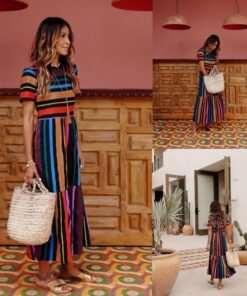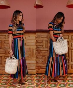 summer holiday dress women stripe boho short sleeve long maxi dress